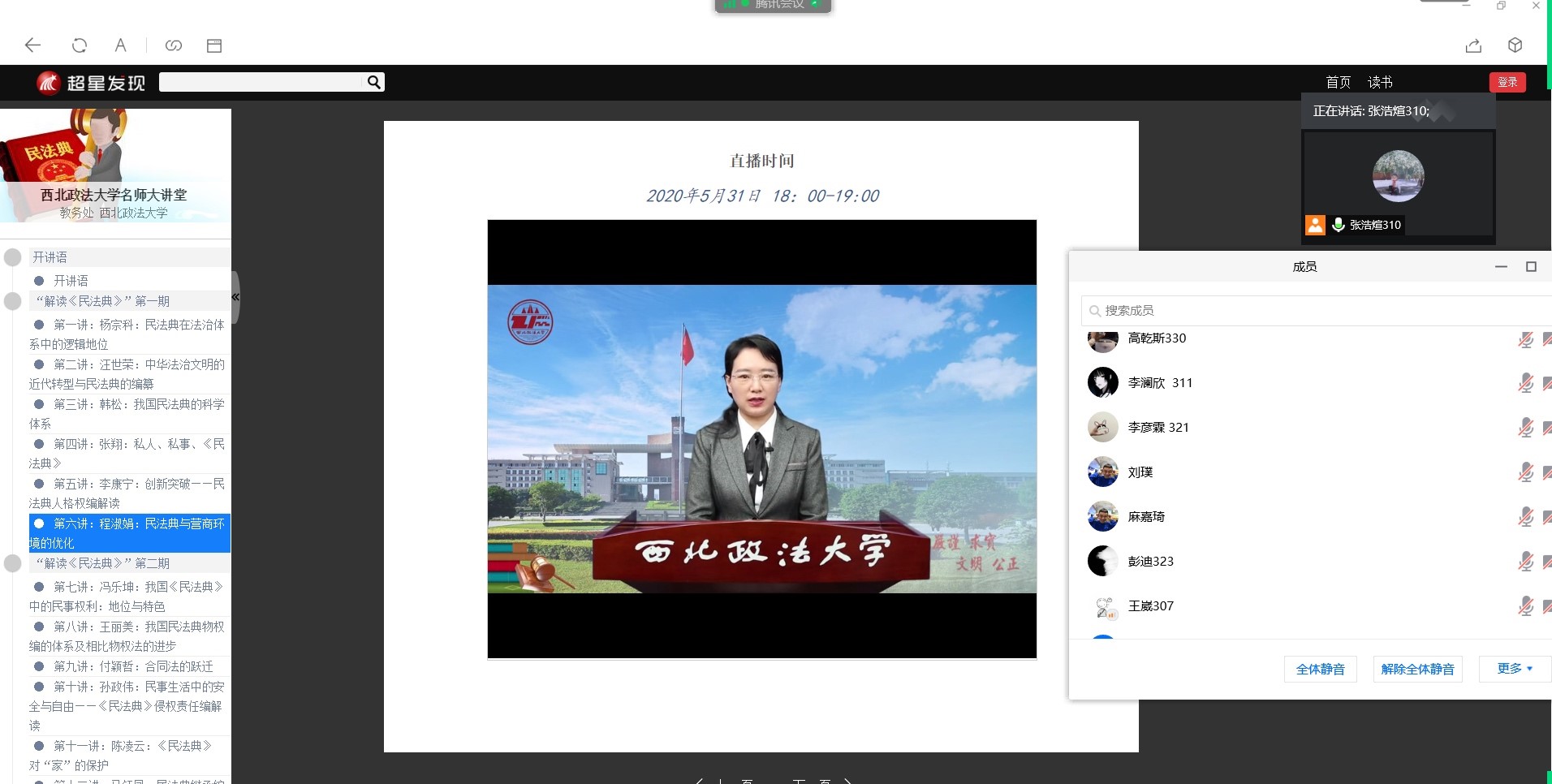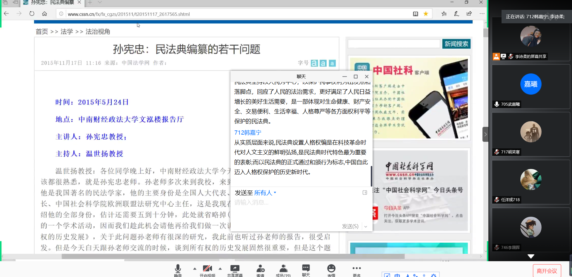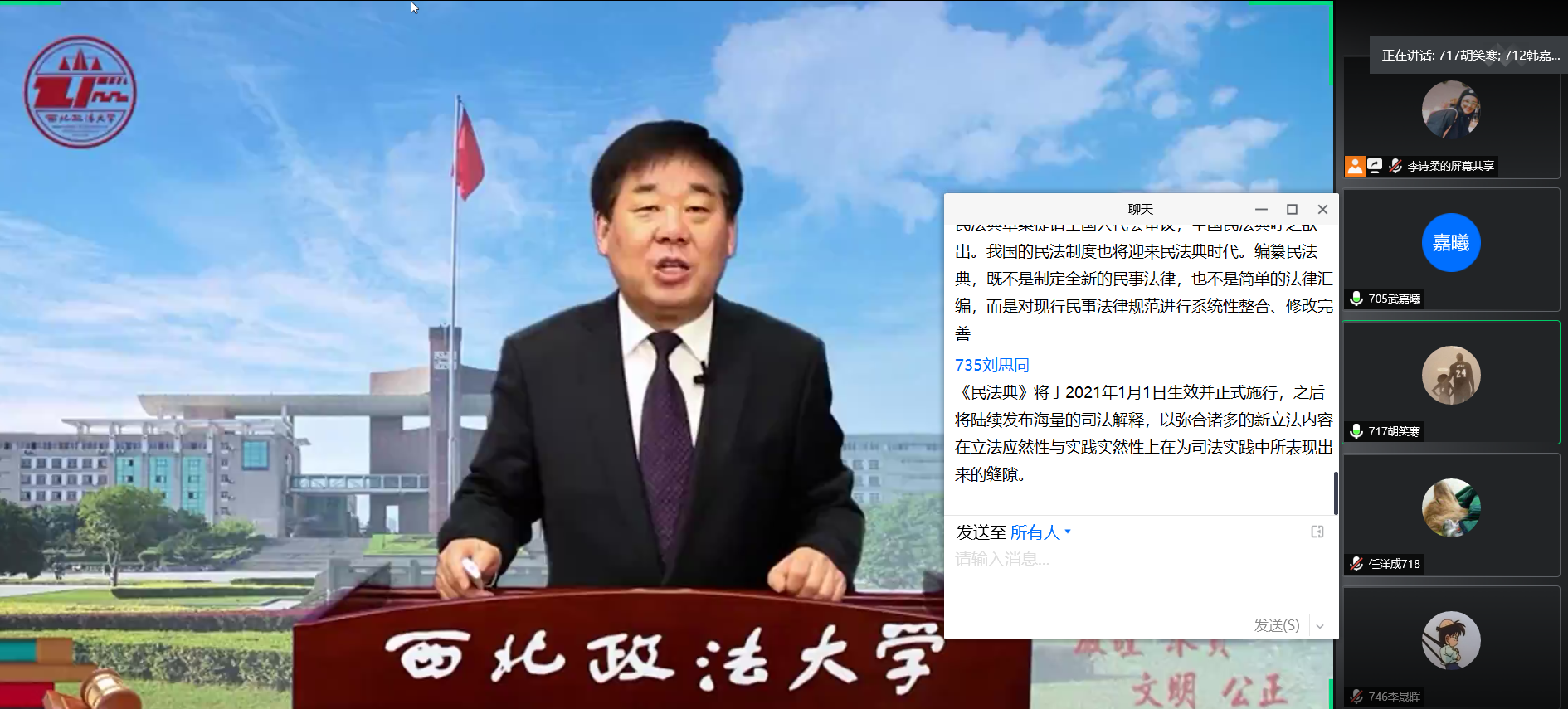 2017级的全体同学们通过观看公司名师组织同学们观看公司名师大讲堂系列视频,同学们共同进行线上学习,班内探讨,发表自己的观点和看法。同时组织同学们阅读公司知名员工孙宪忠教授有关于《民法典》编撰的相关问题,深入了解《民法典》从开始到实施的过程,并且进行讨论,相互学习。同学们利用课余时间,积极配合学习,各抒己见,发表自己的看法,是当代老员工们更加关注民生,也为专业课学习提供了更多的实践内容,充实了同学们的课余学习和生活。